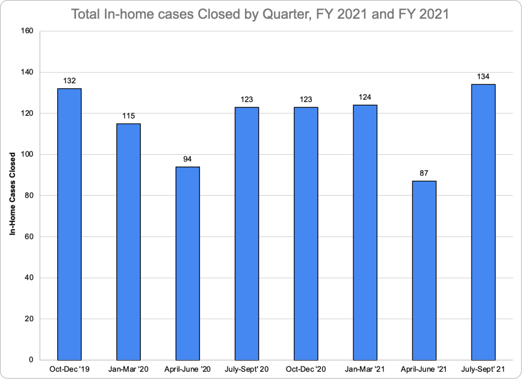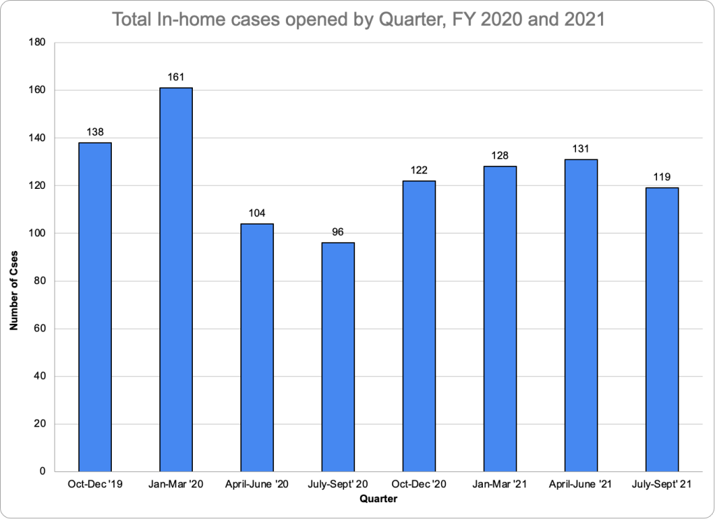 In conclusion, the fourth quarter showed the normal drop in referrals with the closure of school for the summer. There was an increase in hotline calls when schools reopened in person last September, but not the overwhelming influx of calls that some had predicted with the re-opening of school buildings. The number of children and families with in-home cases stayed stable, but the foster care population continued to drop-resulting in a small decline in the number of children served by CFSA from September 2020 to September 2021. CFSA has attributed its declining foster care numbers to its continued commitment to keep families together without formal child welfare involvement when it is safe to do so. We can only hope that CFSA is fulfilling this commitment without jeopardizing child safety.
