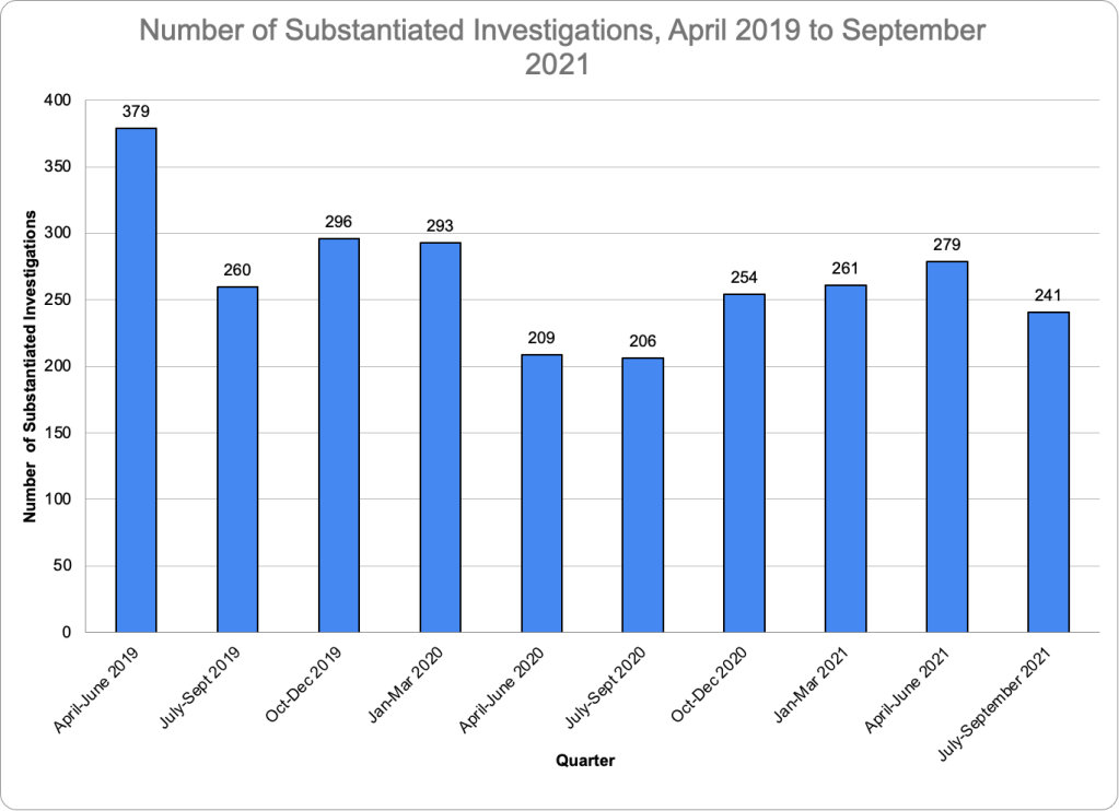 Figure Five shows the large drop in the number of investigations in the first four pandemic quarters compared to four preceding quarters. In the fourth quarter of FY 2021, the number of investigations was closer to pre-pandemic levels but still lower - 1030 in FY 21 versus 1176 in FY 2019. Notably, the number of investigations hardly dropped in quarter 4 over quarter 3 even though the number of referrals (shown above) dropped greatly. This lack of a summer drop in investigations reflects the increased percentage of referrals accepted, as discussed above. It’s as if the agency was trying to keep the number of investigations constant by rejecting more referrals when they received more of them, but this may just reflect the lower credence given to referrals from schools.