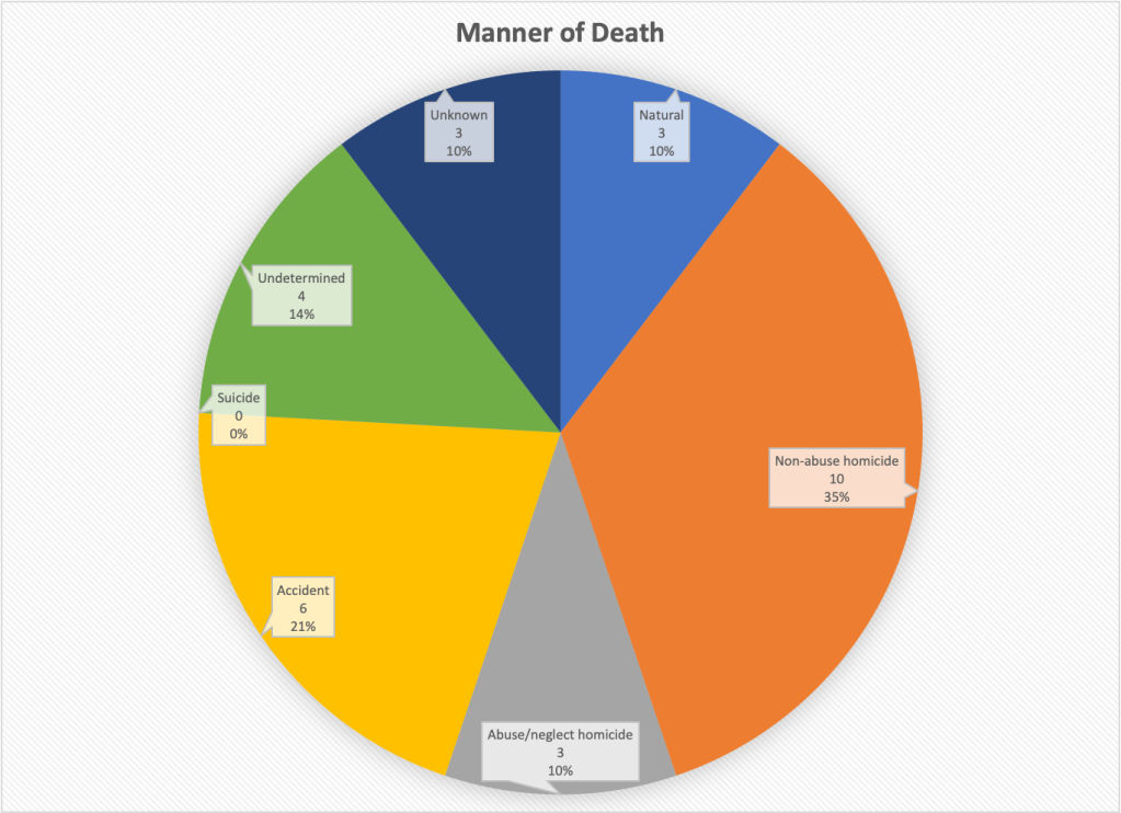 Two deaths has known causes but the manner - whether abuse or neglect or something else - was not determined. A twelve-year-old girl with asthma died of an untreated bacterial infection and pneumonia but also had enough bruising from two separate beatings in the previous two days to support a CFSA substantiation of the mother for physical abuse. It is unclear why this was not considered a medical neglect homicide. A ten-month-old girl died of asphyxia but the manner of death was undetermined. Her mother had left her in the care of her father and returned to find her unresponsive.