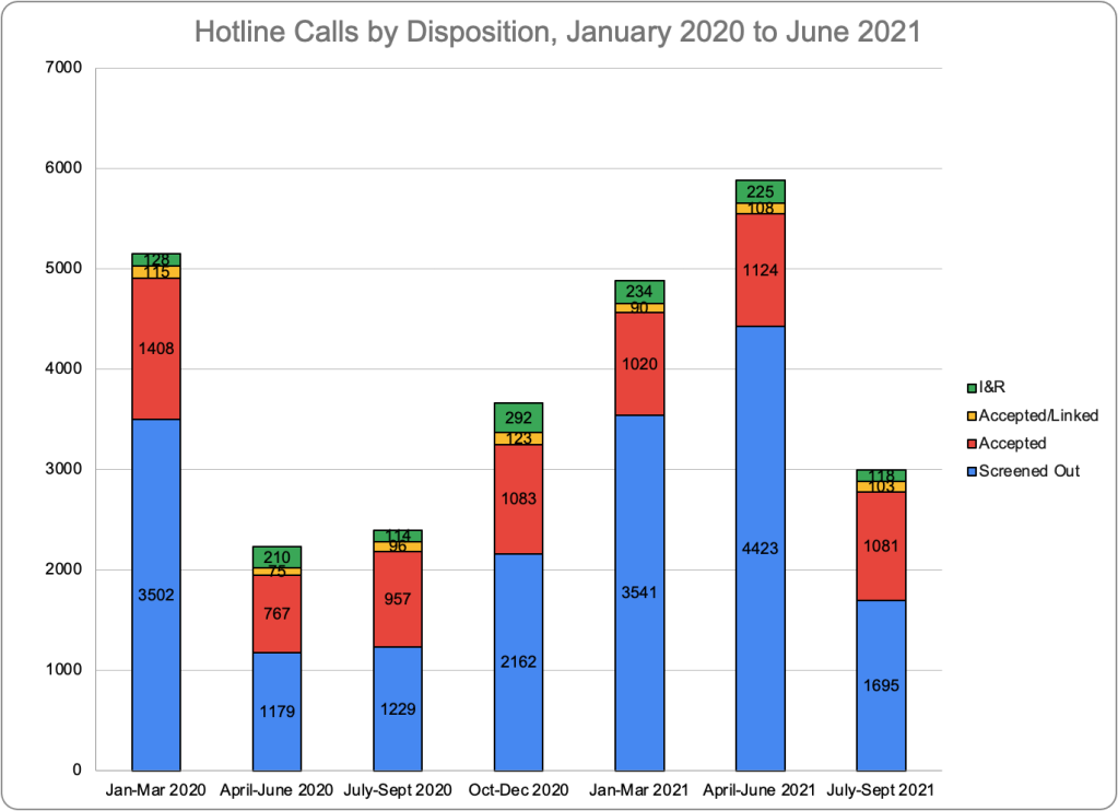In conclusion, the fourth quarter showed the normal drop in referrals with the closure of school for the summer. There was an increase in hotline calls when schools reopened in person last September, but not the overwhelming influx of calls that some had predicted with the re-opening of school buildings. The number of children and families with in-home cases stayed stable, but the foster care population continued to drop-resulting in a small decline in the number of children served by CFSA from September 2020 to September 2021. CFSA has attributed its declining foster care numbers to its continued commitment to keep families together without formal child welfare involvement when it is safe to do so. We can only hope that CFSA is fulfilling this commitment without jeopardizing child safety.