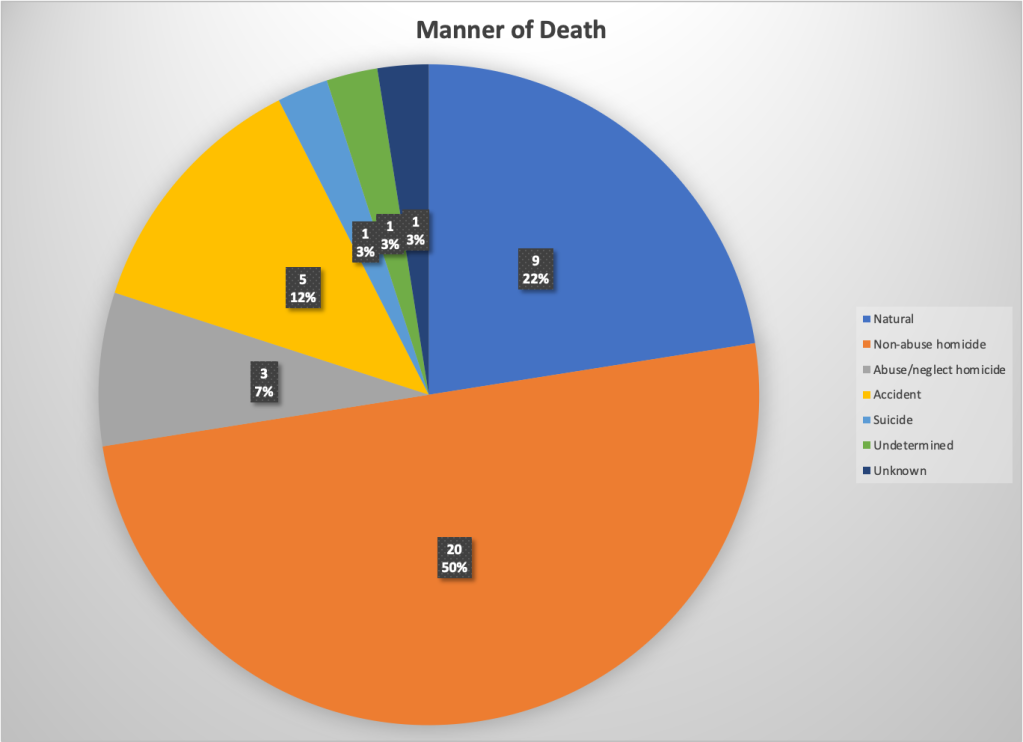 Three of the children died of blunt force trauma-one of the two most common causes of death in the sample. The murders of two of these children - Makenzie Anderson and Gabriel Eason - - became known to the horrified public through press coverage of their deaths in February and April of 2020. Each of them died from head trauma inflicted by a parent or stepparent. Makenzie suffered from multiple contusions to the face and head, skull fractures, and other injuries, and her mother pleaded guilty to manslaughter, receiving a ten-year prison term with seven years suspended on the condition that she obtain mental health treatment and have no unsupervised contact with children. Gabriel’s autopsy found abrasions and contusions to the head, face and torso; contusions to the heart and thymus gland; liver and kidney laceration; new and healing fractured ribs; and a brain hematoma. His stepfather was sentenced to 12 years and eight months in prison and his mother, who did not seek medical help for Gabriel or his critically-injured three-year-old brother, was sentenced to four years of probation and three years of supervised release.