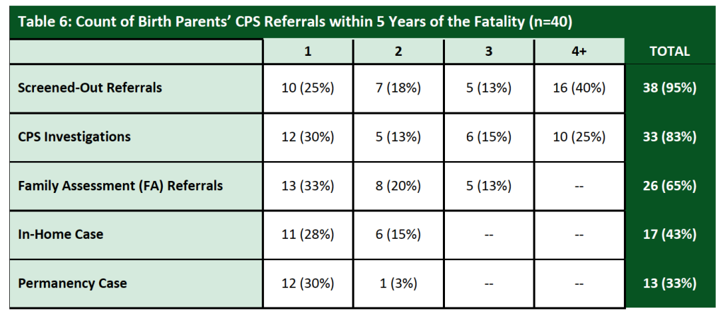 Note: One family was not included because they had no open case or investigation during the five years before the child fatality. The family did have four screened-out referrals.