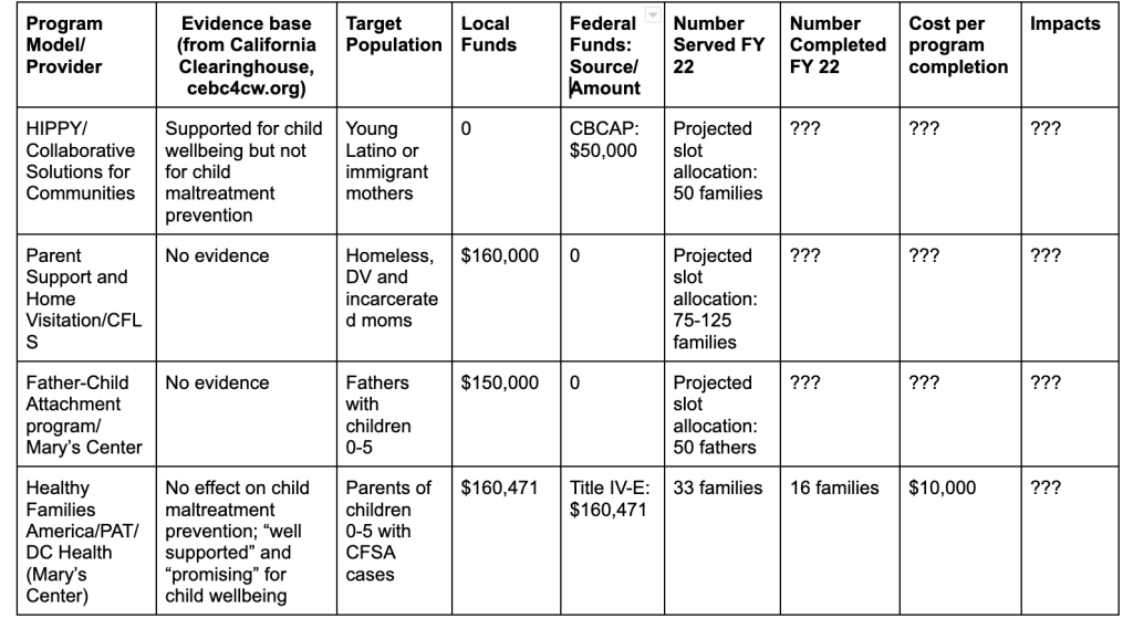 Adding the “Front Porch” and “Front Yard” children to the children served in their homes and in foster care gives the impression that the number of children and families served has not fallen but in fact has increased in recent years. That may be technically true, but there are serious problems with that assertion. First, the total number of children served by the Collaboratives began declining in FY2021, and it is not clear what the future holds. Second, the services provided by the Collaboratives are typically much less intensive (and therefore cheaper) than CFSA’s in-home services. Collaborative case managers are generally not licensed Masters-level social workers and have much higher caseloads than CFSA in-home workers. Therefore, they often do not have the time or the skills to to provide the same level of services. Collaborative services have had a dubious reputation over the years; one of the first things I heard as a social worker at a private District agency managing CFSA foster care cases is how one could not expect any meaningful services from a collaborative. As a matter of fact, CFSA tried to end its contracts with the Collaboratives in FY2018 under the previous director, Brenda Donald. But the outcry from Collaborative staff and community members (perhaps recruited by the Collaboratives themselves) led her to renew the non-competitive contract for the collaboratives.